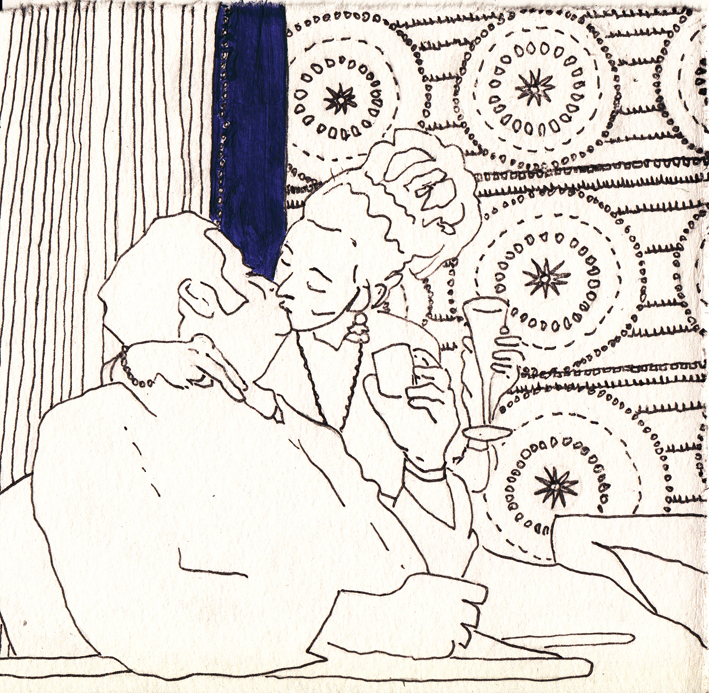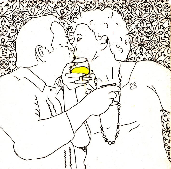 „Der Kuss“ aus der Serie „Familienalbum (Unbekannt 1971-76)“, Fineliner, Acryl auf Papier, 16,5 x 16 cm, 2015