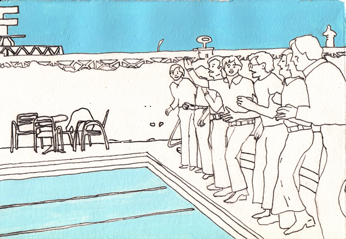 Zeichnung von einer Grupee junger Männer beim Party machen am Pool