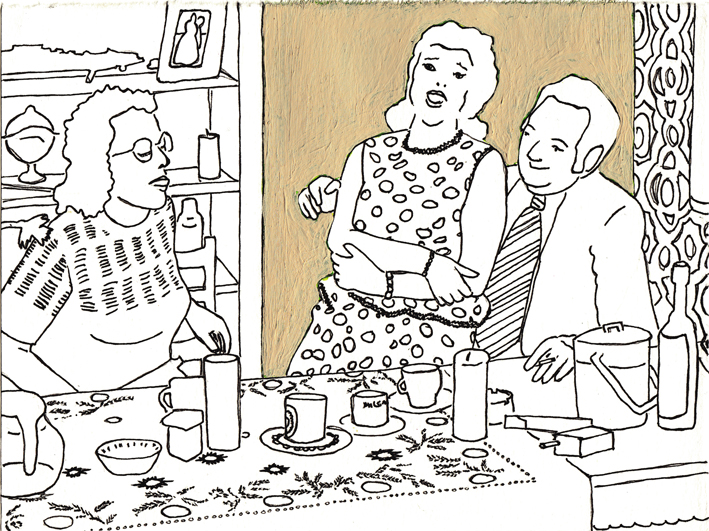 „Party“ aus der Serie „Familienalbum (Unbekannt 1971-76)“, 2015, Acryl, Fineliner auf Papier, 16 x 23 cm