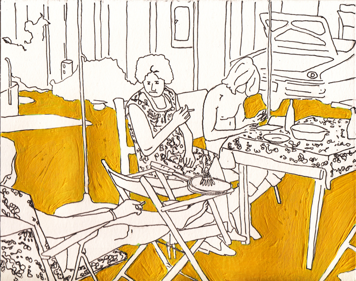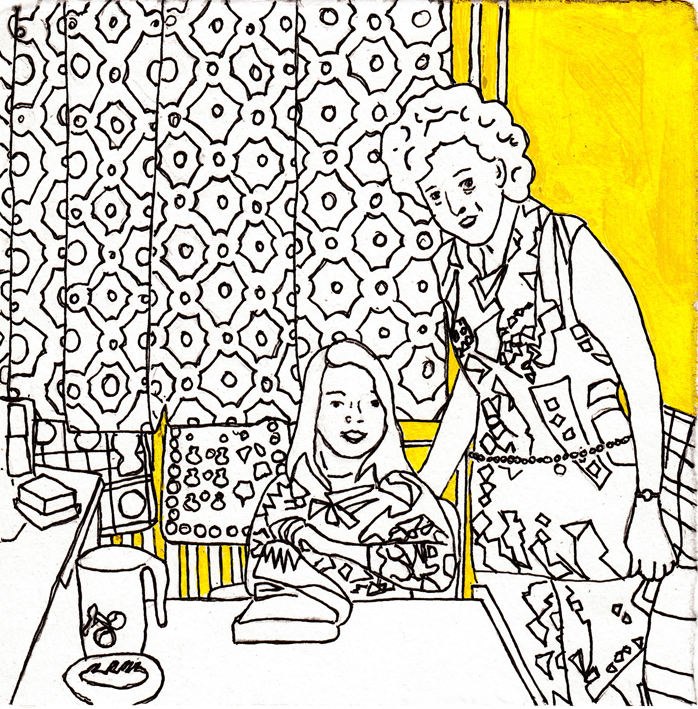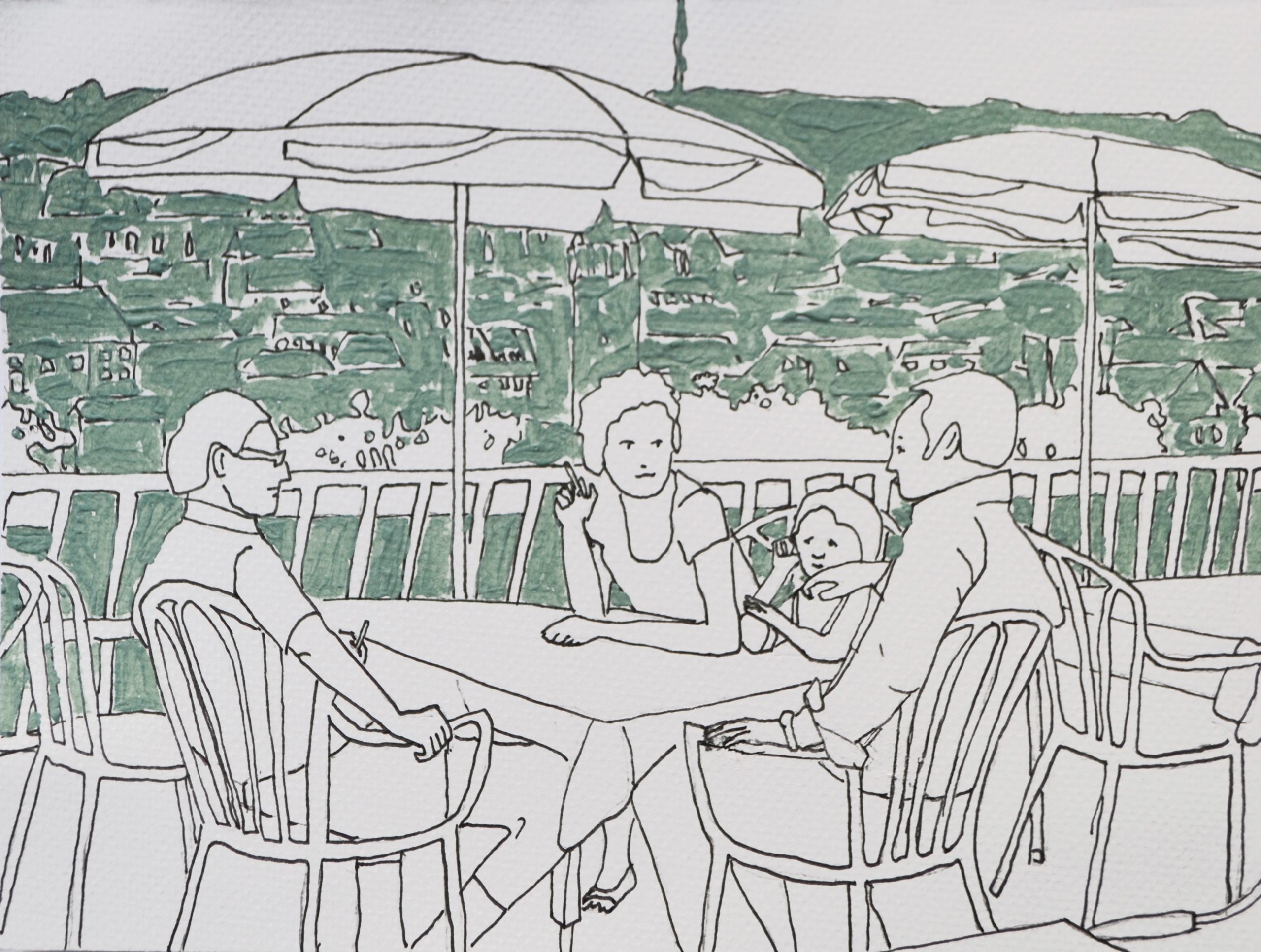 „Café“ aus der Serie „Familienalbum (Unbekannt 1971-76)“, 2017, Acryl, Fineliner auf Papier, 16 x 20,5 cm