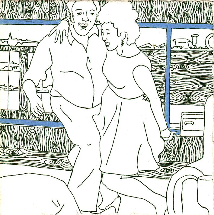„Der Tanz“ aus der Serie „Familienalbum (Unbekannt 1971-76)“, Fineliner, Acryl auf Papier, 16 x 16 cm, 2017
