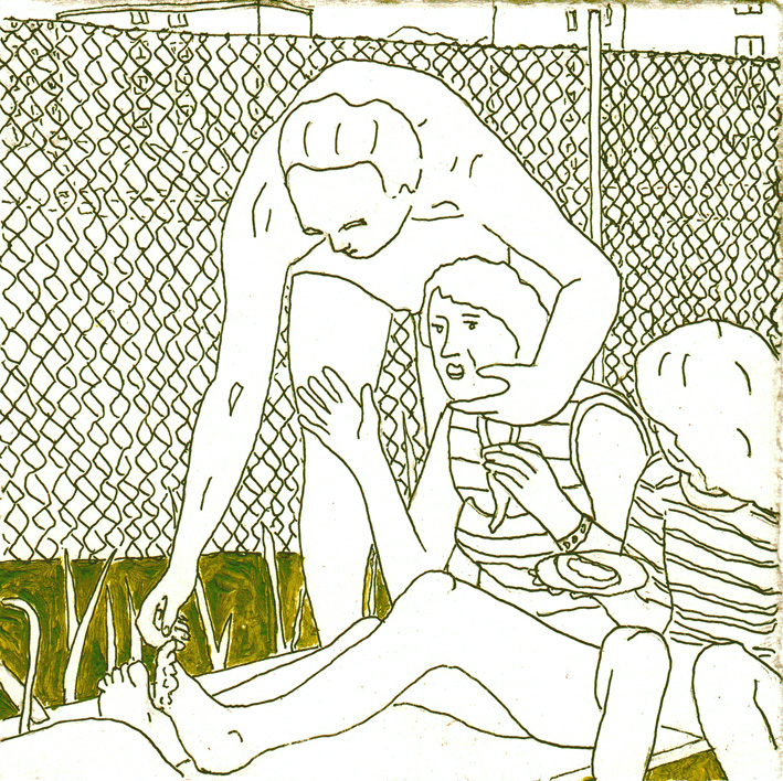 „Zaun“ aus der Serie „Familienalbum (Unbekannt 1971-76)“, 2017, Acryl, Fineliner auf Papier, 16 x 16 cm