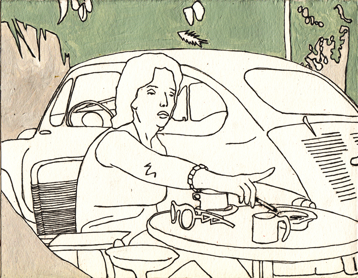 „Frau, Auto, Hund“ aus der Serie „Familienalbum (Unbekannt 1971-76)“, Fineliner, Acryl auf Papier, 16 x 23 cm, 2015